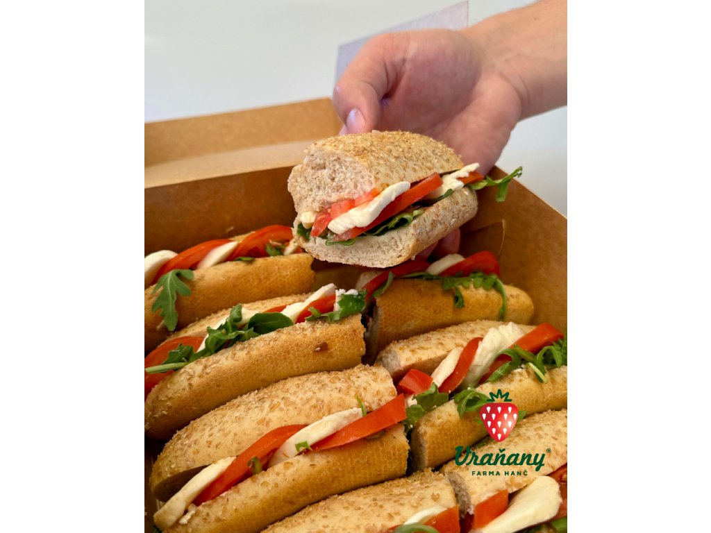 Každá bagetka je plněná mozzarellou, rajčetem a salátkem, jemně namazaná smetanovým máslem s balzamikem.