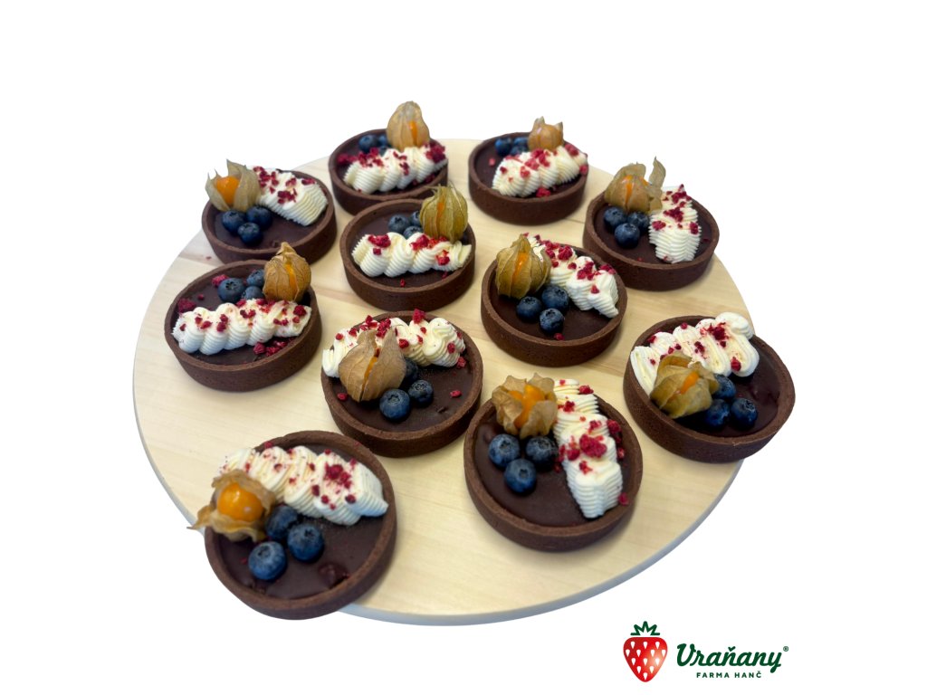 Čokoládová tartaletka – Čokoládový korpus s vraňanským džemem a hořkou čokoládou.
